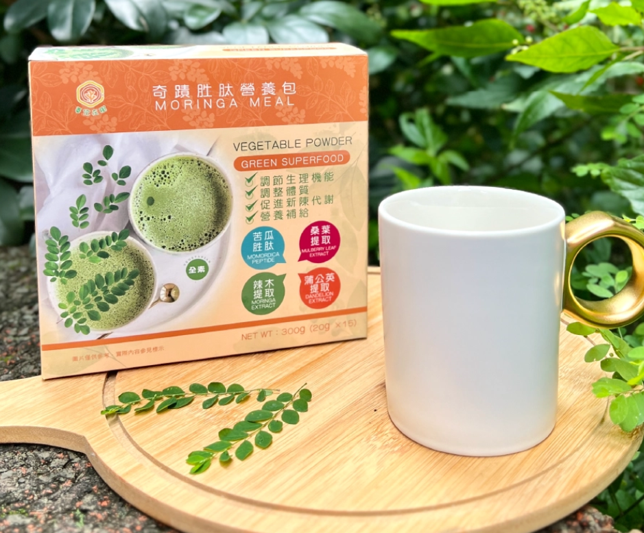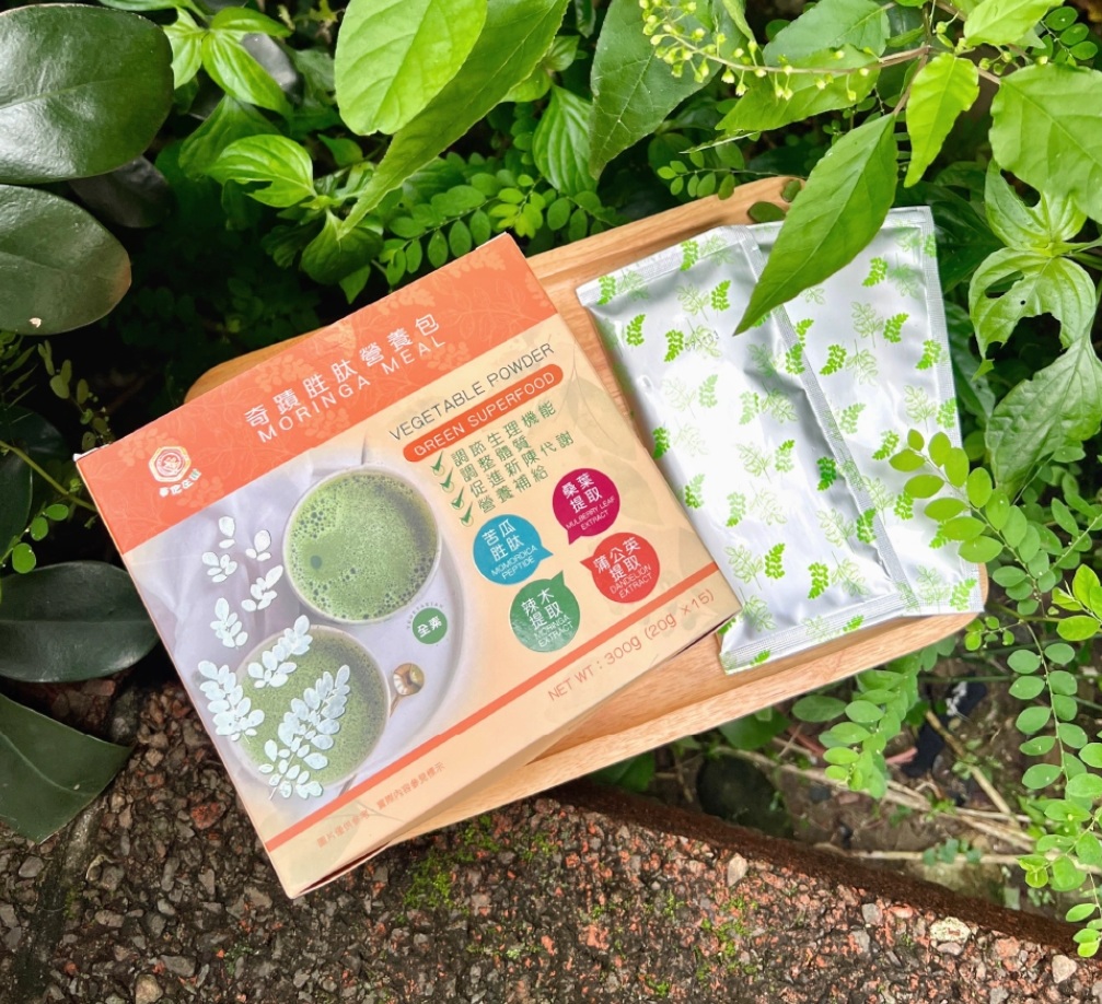 成分:辣木葉粉、苦瓜胜肽、桑葉萃取物、蒲公英萃取物、綜合穀物(黃豆、綠豆、黑豆、玄米、糙米、紅豆、花豆、芝麻、燕麥、大麥、小麥、蕎麥、黑糯米、扁豆)、洋車前子、馬鈴薯、麥粉、樹薯澱粉、紅蘿蔔、高麗菜、香菇風味調味粉(鹽、L-麩醯胺酸鈉、香菇粉、調味料(DL-胺基丙酸、胺基乙酸、焦糖色素))、海帶芽、芝麻、酵母抽取物、關華豆膠、食鹽、香菇、洋香菜、白木耳、香料、椰子油、咸豐草、紅藻鈣